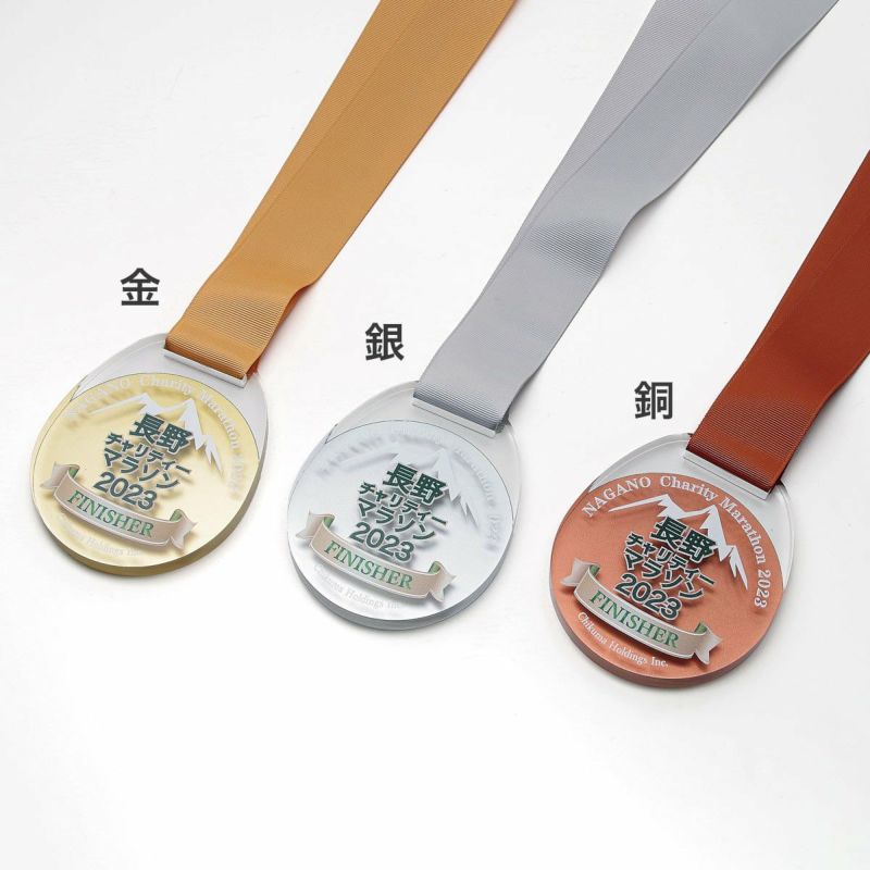 アクリル製メダルの裏面には金銀銅それぞれのラッカー加工を施しています。