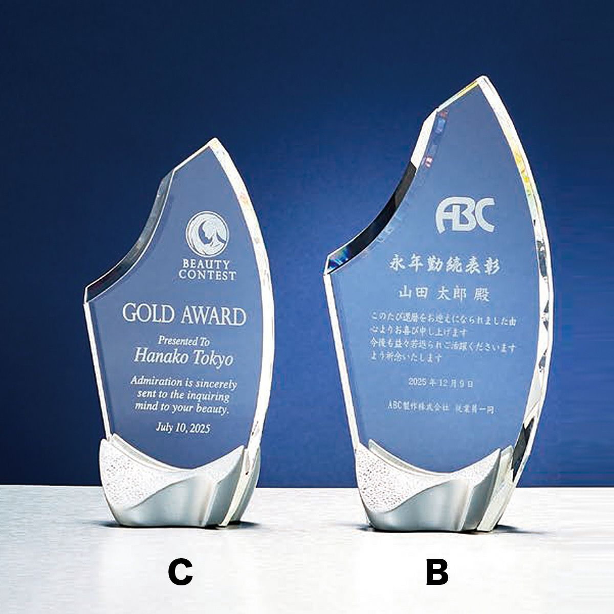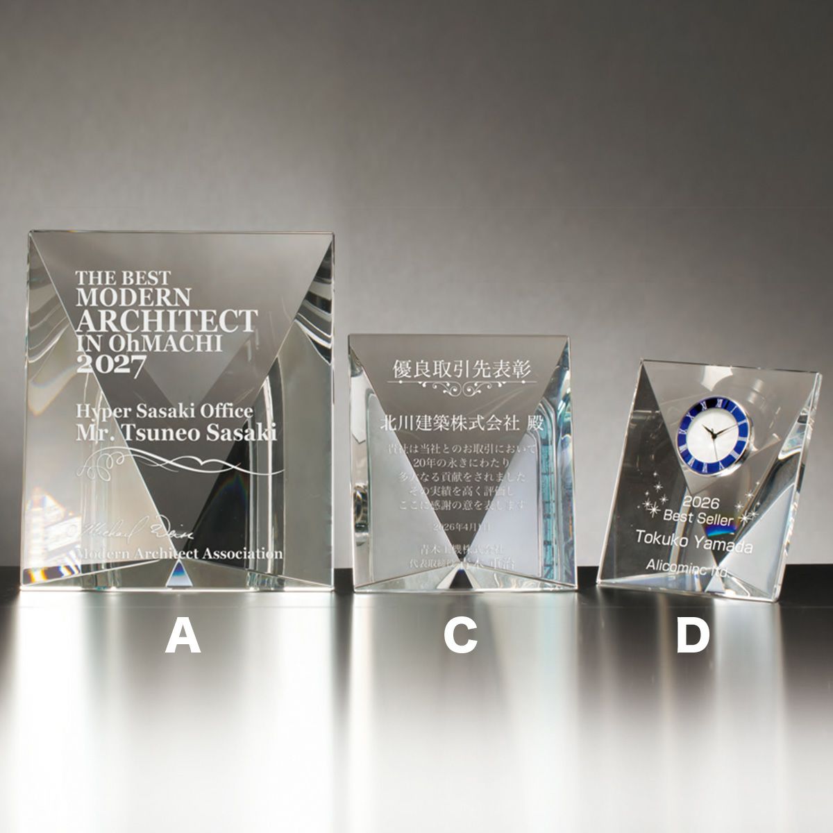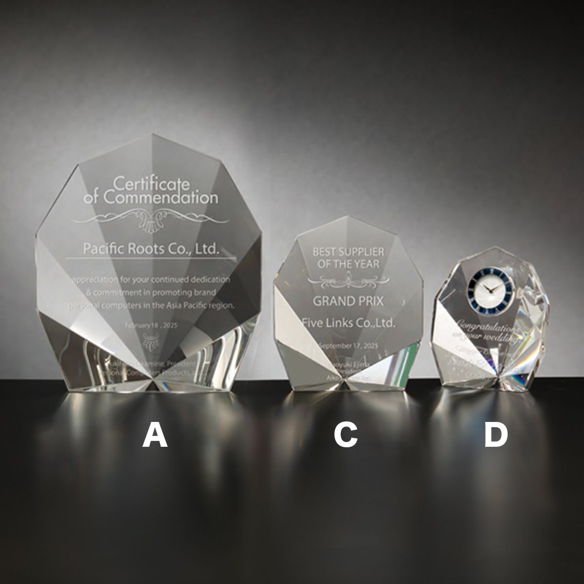 クリスタルや光学ガラス、成型ガラスなど複数の素材があり、本金箔やレリーフを組み合わせたタイプもございます。サイズ展開も豊富で、ランク分けや特別賞など多様な表彰に対応できます。