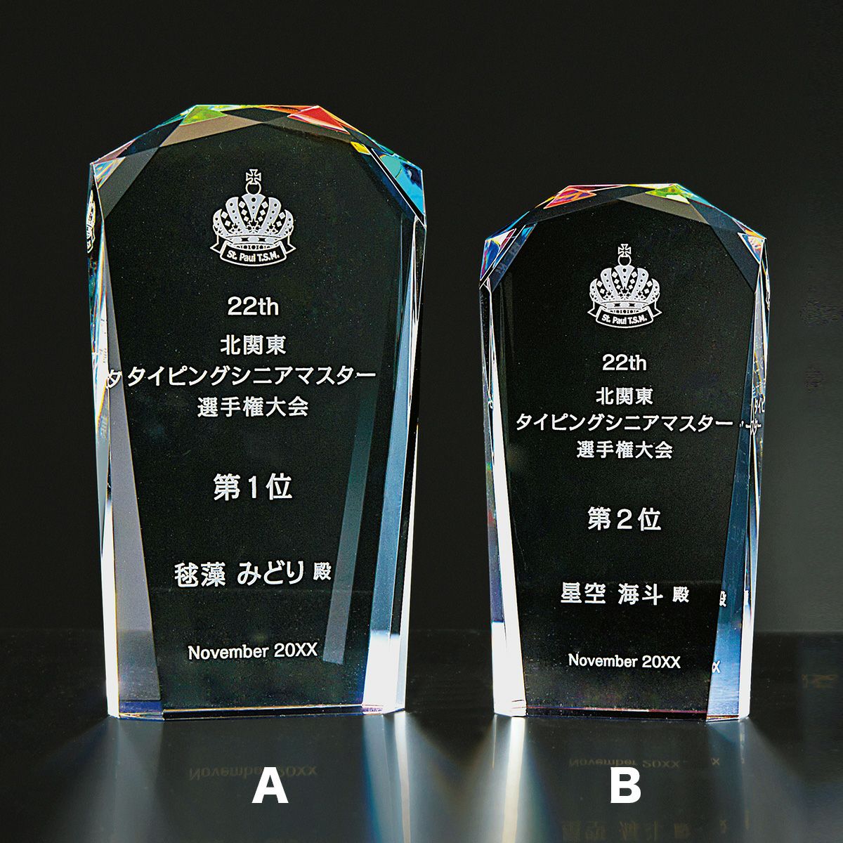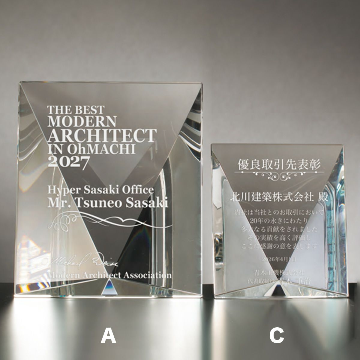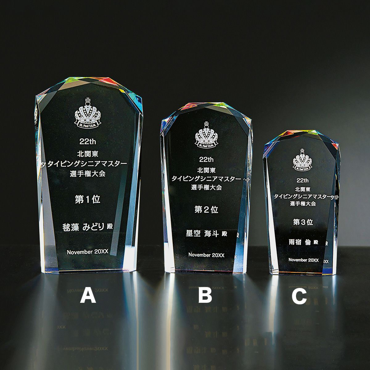 クリスタルや光学ガラス、成型ガラスなど複数の素材があり、本金箔やレリーフを組み合わせたタイプもございます。サイズ展開も豊富で、ランク分けや特別賞など多様な表彰に対応できます。