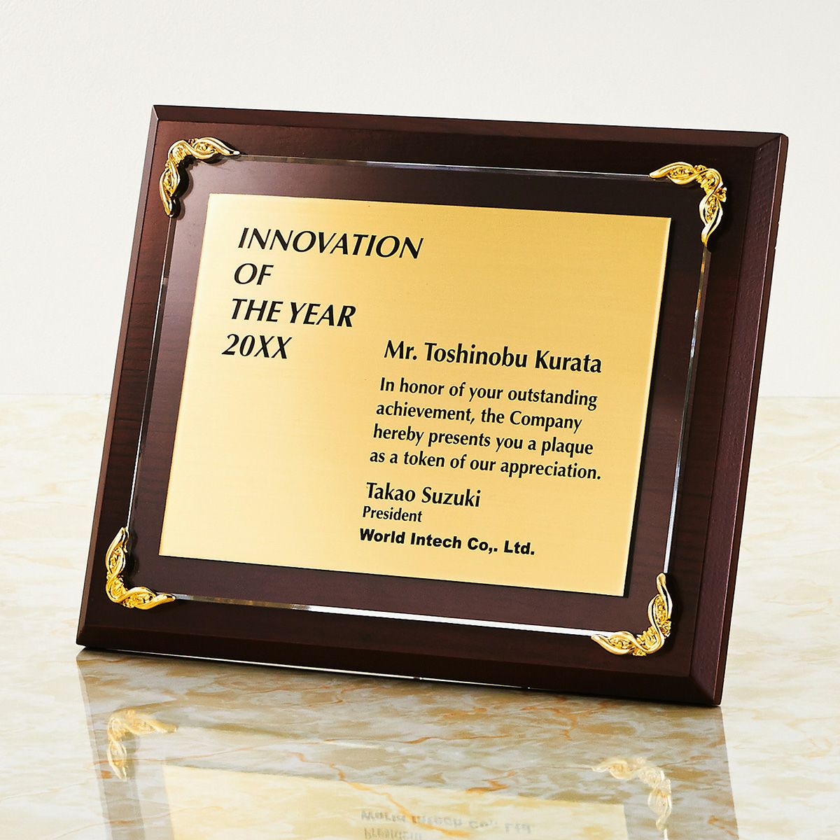 ミラーにダイレクトプリントし、木製板との組み合わせで他にはないミラー特有の質感がある表彰楯となります。