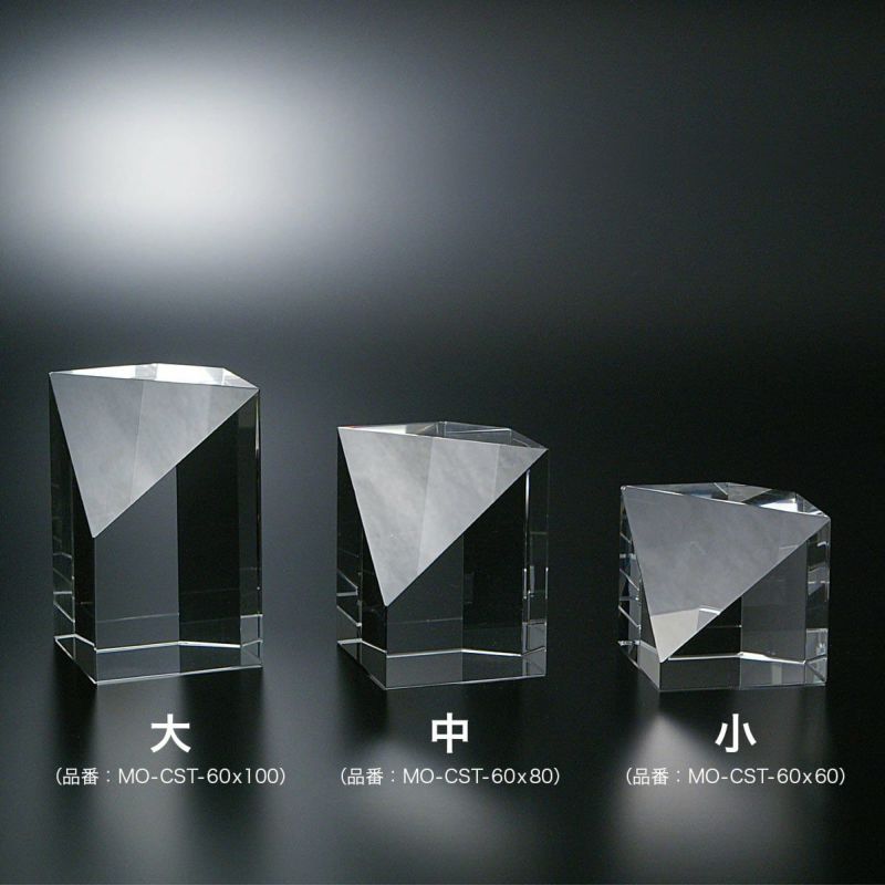 直方体のブロック形状から前は斜めに後ろは垂直にカットを入れたトロフィーです。前面の斜めの三角部分に名入れします。小さめですが、光の反射が美しいお手頃なお薦めトロフィーです。