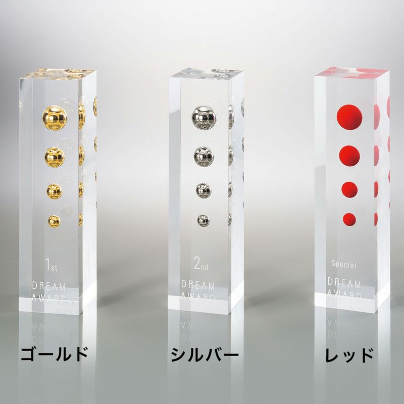 球体封入・日の丸から発想を得た赤色の球体、そして歓喜の瞬間を表すような光沢のある無垢の金、銀の金属球を正確な配置でアクリルの中に閉じ込めました。球体の弾むようなリズムが喜びを表します。
