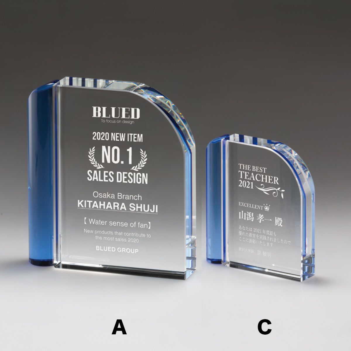 ロゴやオリジナルの表彰メッセージ等、豊かな表現が可能です。レリーフ部分のみにフルカラーで加工ができるお手頃な樹脂製商品から、本体に加工する、透明なガラスやアクリル製の商品まで様々です。台座のプレートに文字彫刻等も可能 な商品もございます。