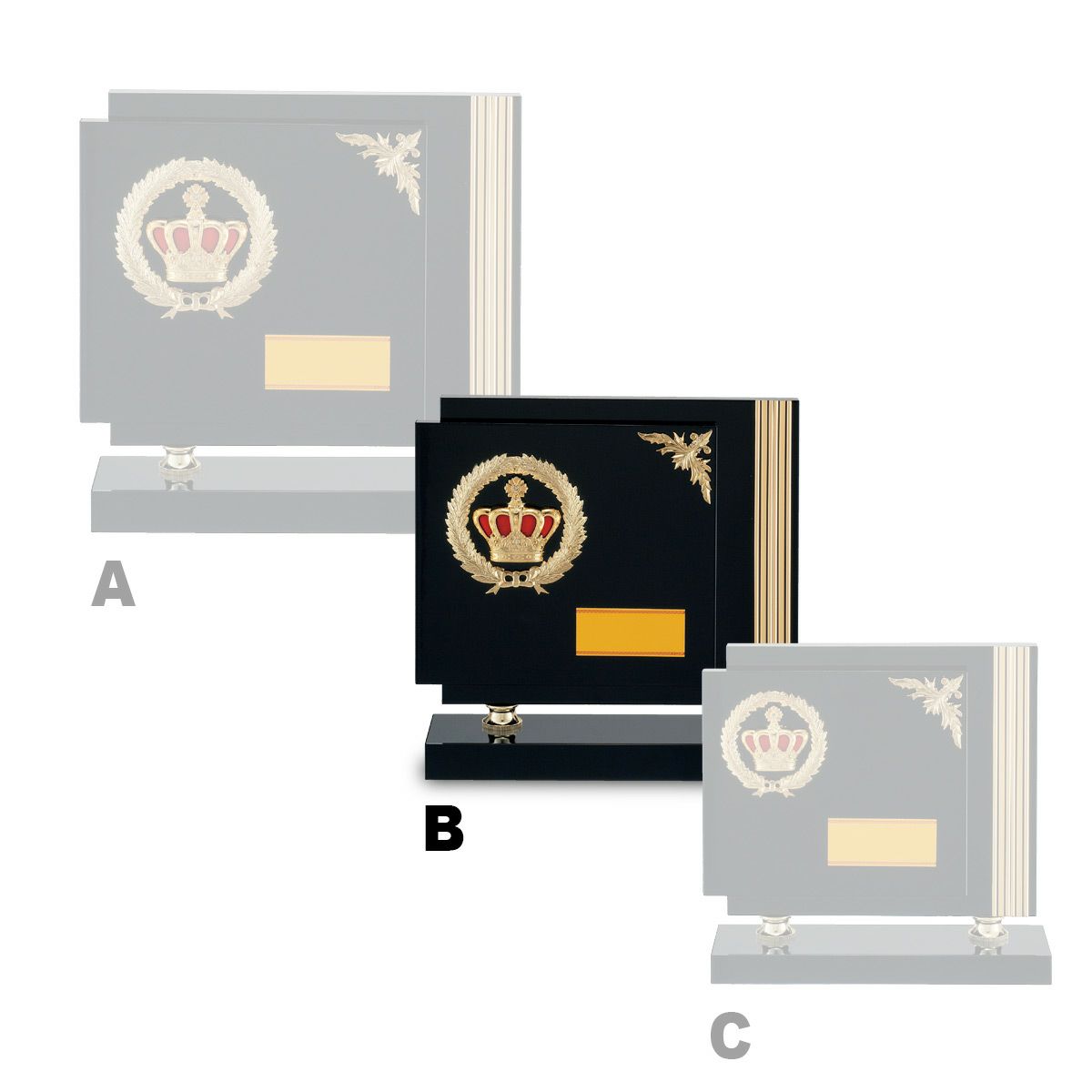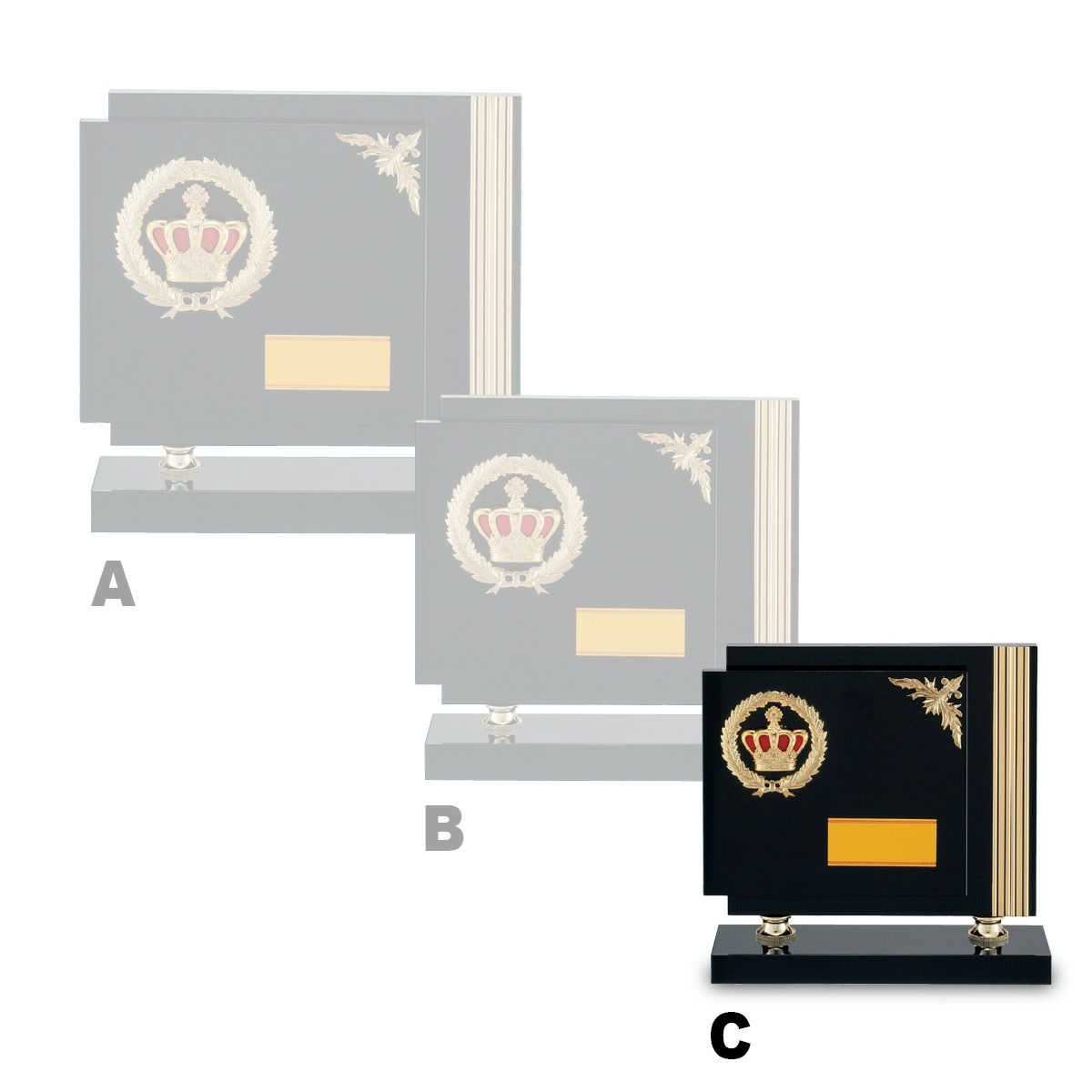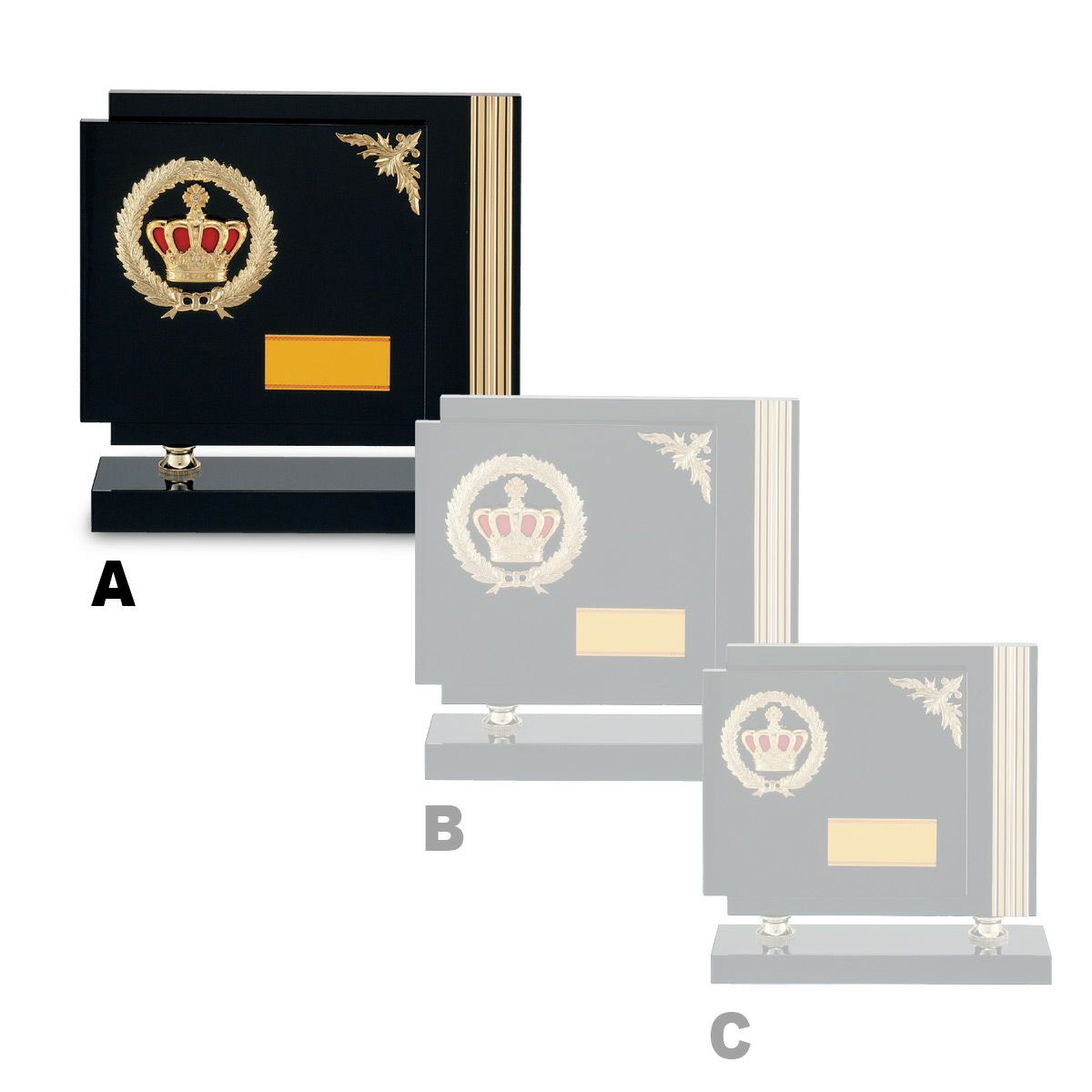 レリーフの素材は主に樹脂製で、金色や銀色、銅色などのメッキで仕上げております。華やかな「王冠」のレリーフをメインに、繊細な「月桂樹」レリーフとの組み合わせは、品格がありデザインも豊富です。