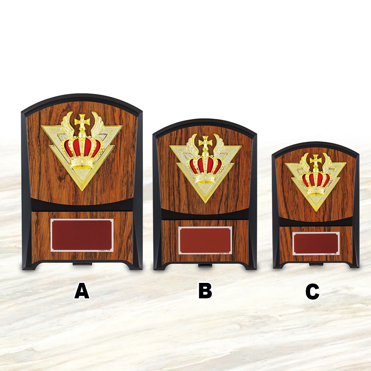 楯板の素材には天然木圧縮材を使用し、天然石や美しい木目を表現しています。楯のデザインに合わせた繊細な装飾のあしらいは「王冠」のレリーフを引き立て、重厚感のある記念楯となっております。