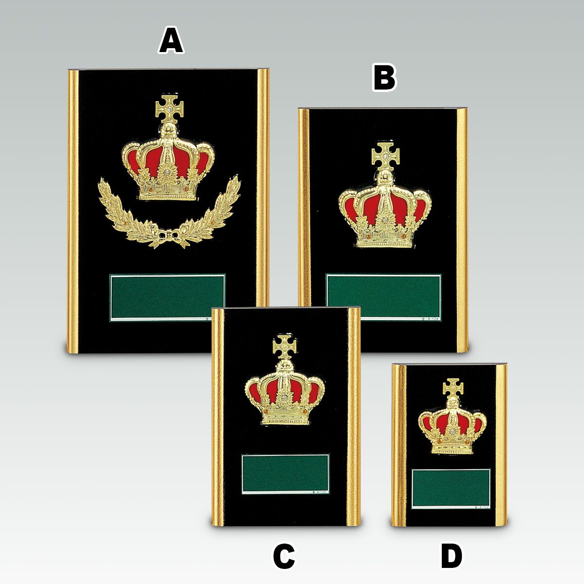 レリーフの素材は主に樹脂製で、金色や銀色、銅色などのメッキで仕上げております。華やかな「王冠」のレリーフをメインに、繊細な「月桂樹」レリーフとの組み合わせは、品格がありデザインも豊富です。