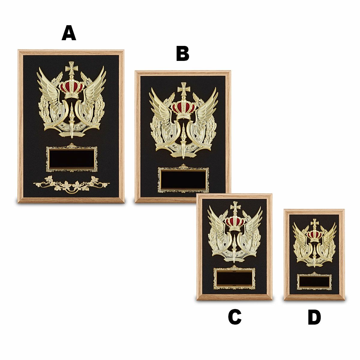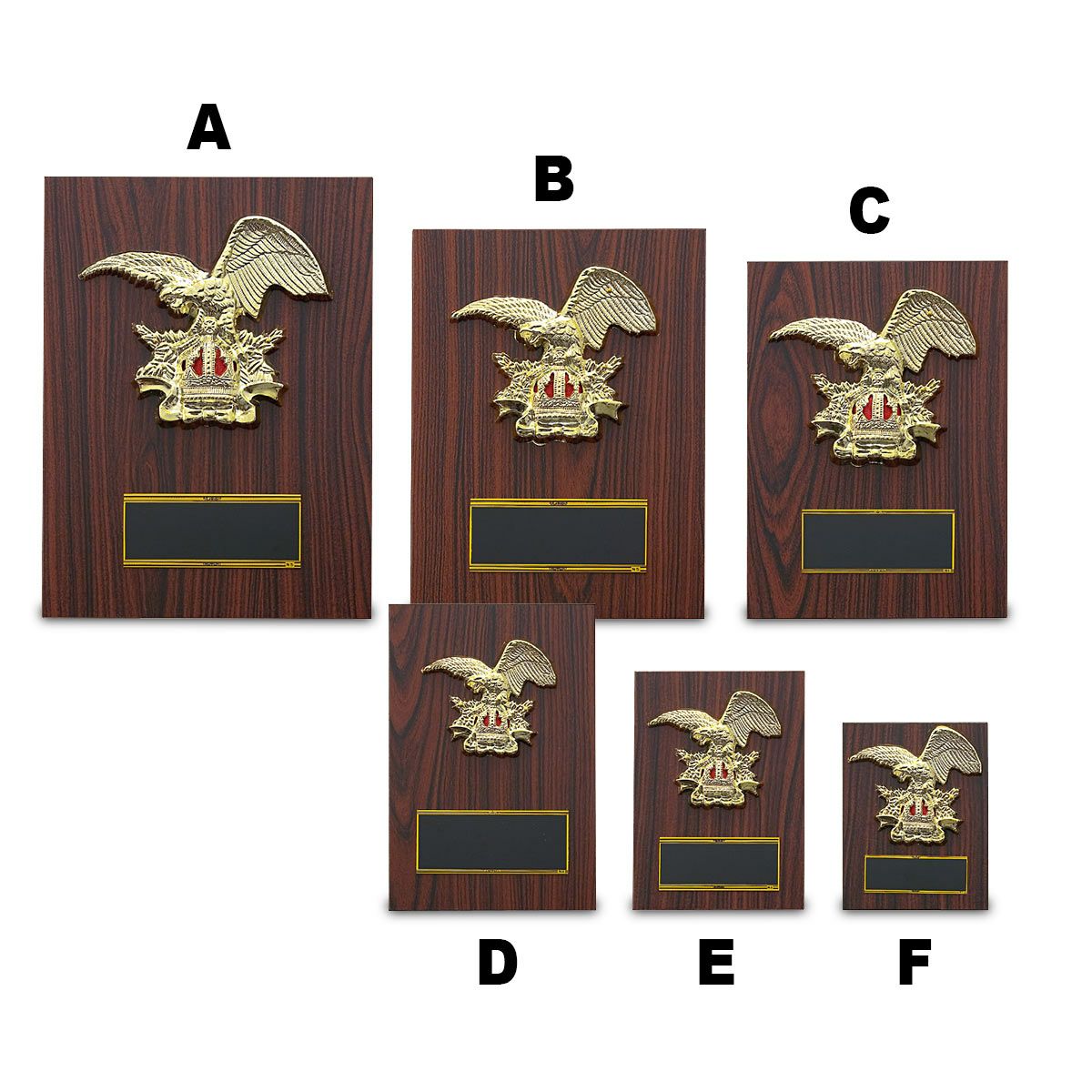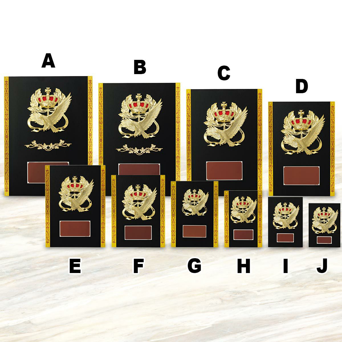 - 「鷲」を中心に王冠や女神のレリーフをあしらった、重厚感ある木製楯です。天然木圧縮材を使用し、温かみと存在感のある仕上がりが特徴です。
