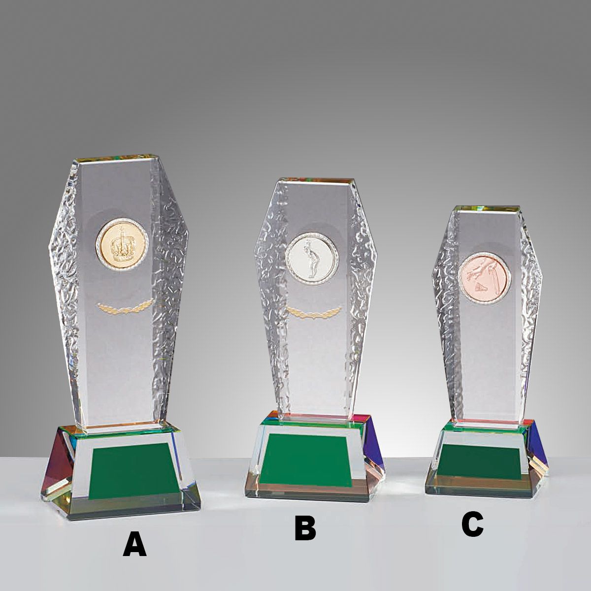 トロフィー本体のデザインは、柱のあるチャンピオントロフィーや、人気のスタンダードトロフィー、ブロンズやクリスタルトロフィーなど、素材や種類を幅広く取り揃えておりますので、レリーフとの組み合わせで幾通りものトロフィーがお客様のお好みに合わせてお選びいただけます。