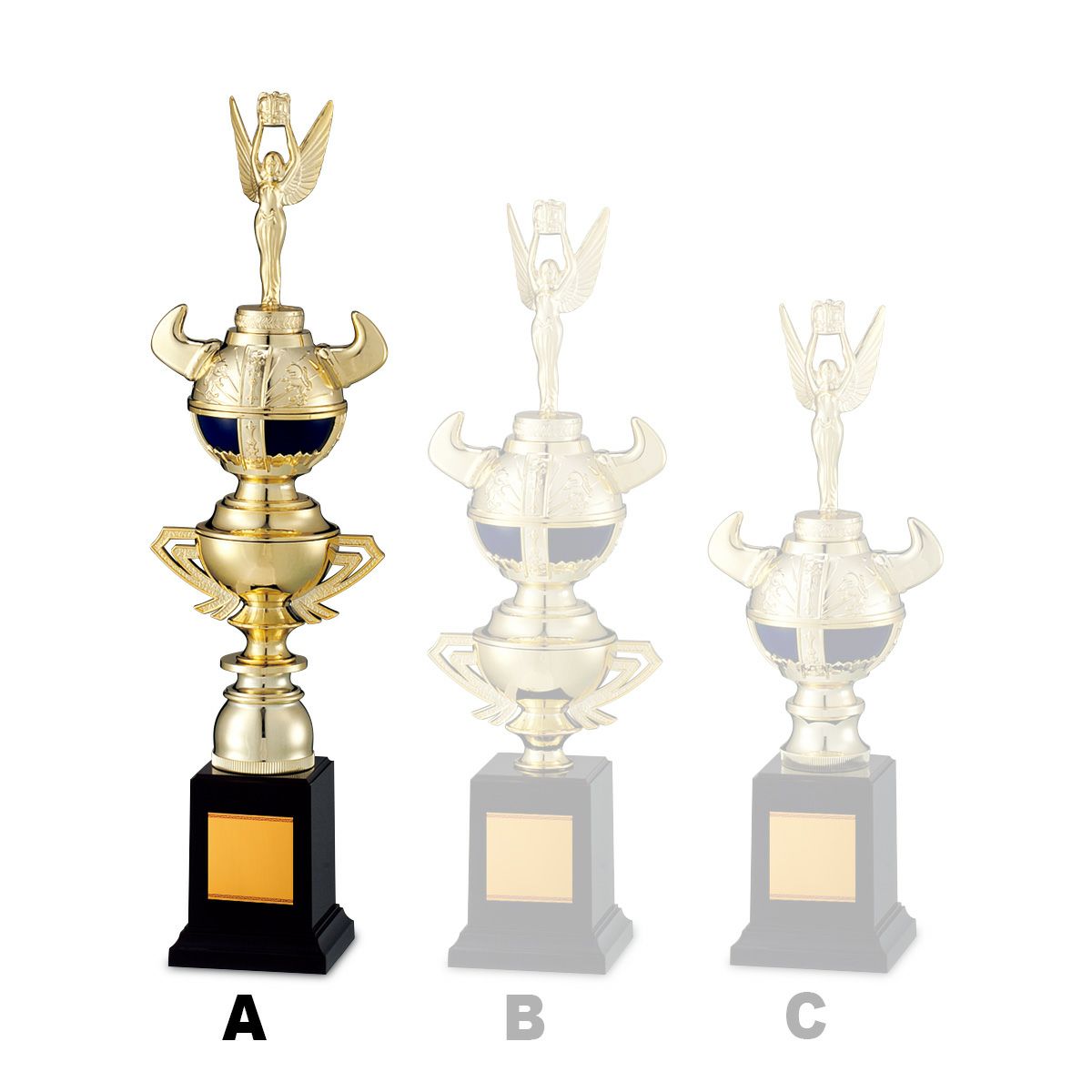 ビッグイベントや参加者の多い大会などの場合は、高さ1mを超えるチャンピオントロフィーがよく選ばれています。トロフィーの大きさで、大=優勝・中=準優勝・小=第3位と大中小を同じ品番で揃えるのも、一般的なご利用方法となっています。
