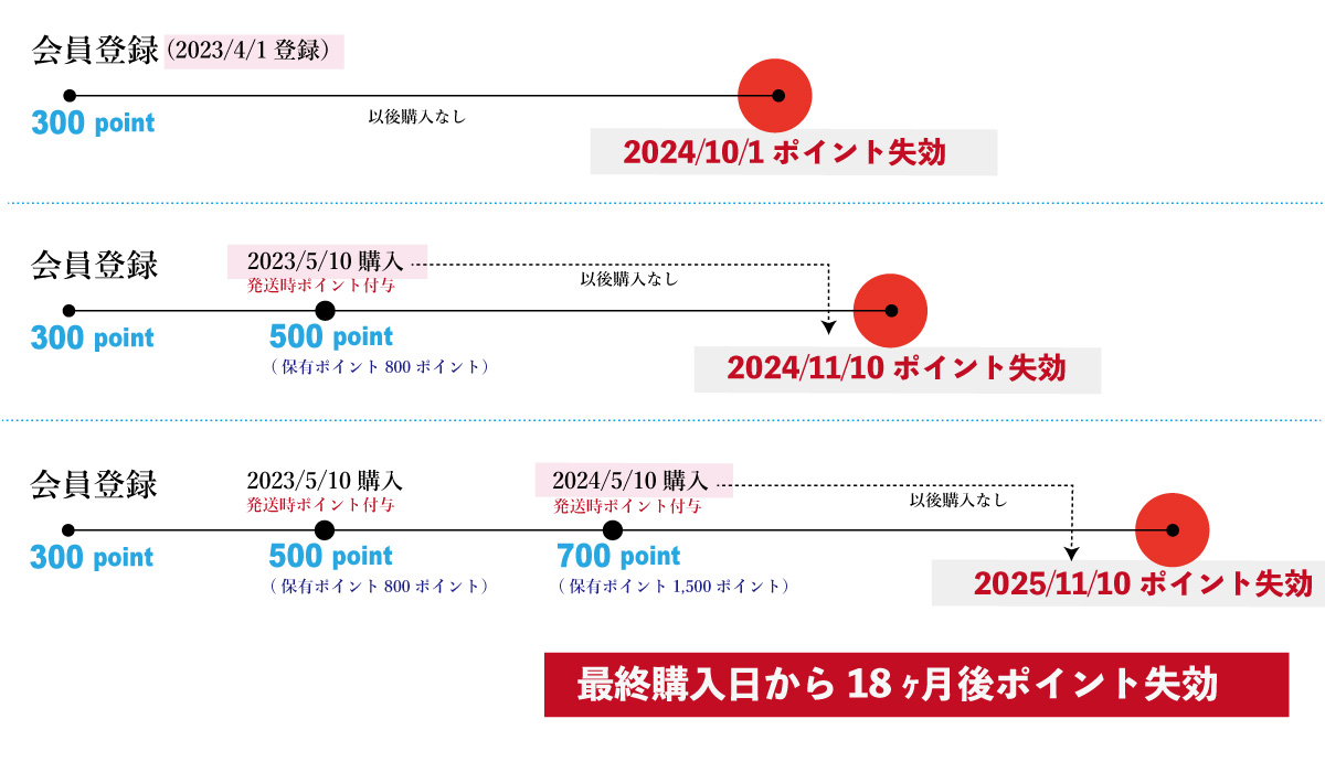 - 但し、期間限定ポイントに関しては、発行時に指定された有効期限で期限切れとなります。