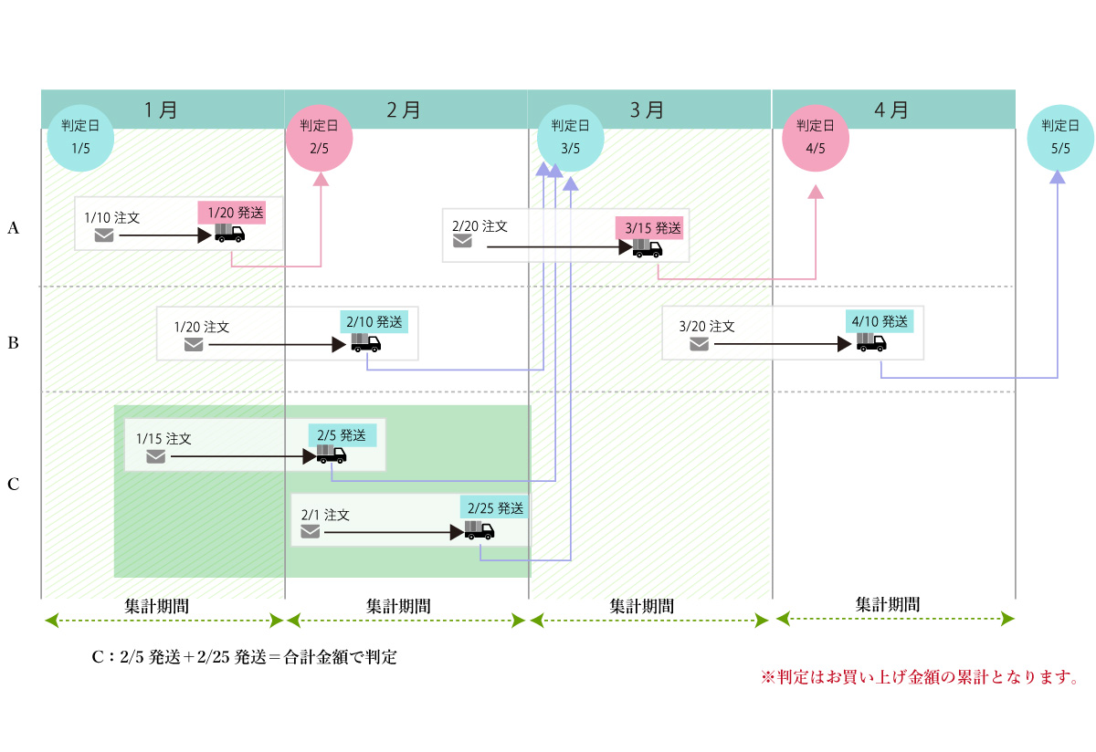 - 毎月1日〜末日までの出荷済みのご注文に対して、ステージ判定を行います。